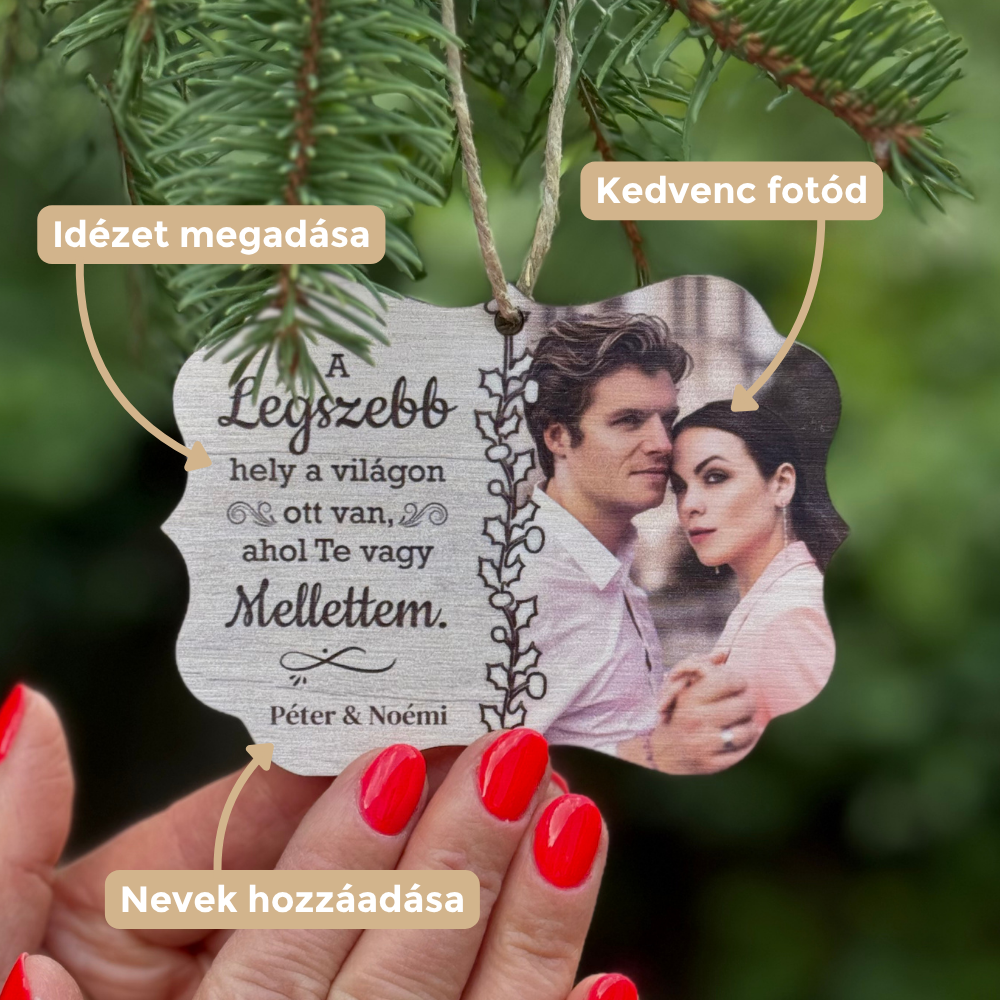 Ennek a karácsonyfadísznek a különlegessége, hogy teljesen személyre szabható – a saját fotóddal, idézeteddel vagy nevetekkel készül. Így válik egy egyszerű díszből örök emlék, ami minden karácsonykor emlékeztet arra, mennyire fontos az összetartozás és a szeretet. Egy ajándék, ami minden alkalommal meghat és mosolyt csal a szívekbe.