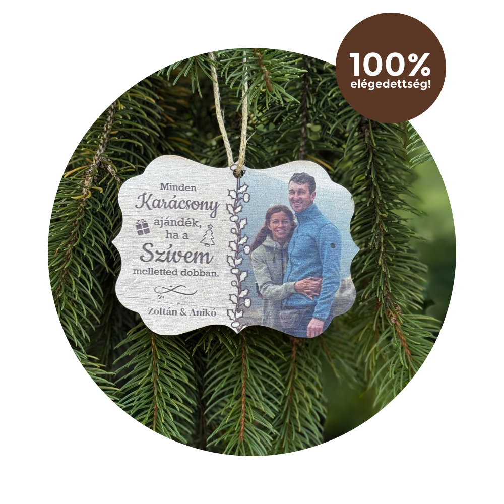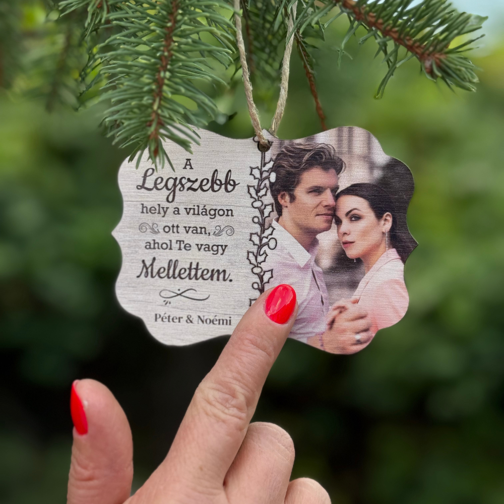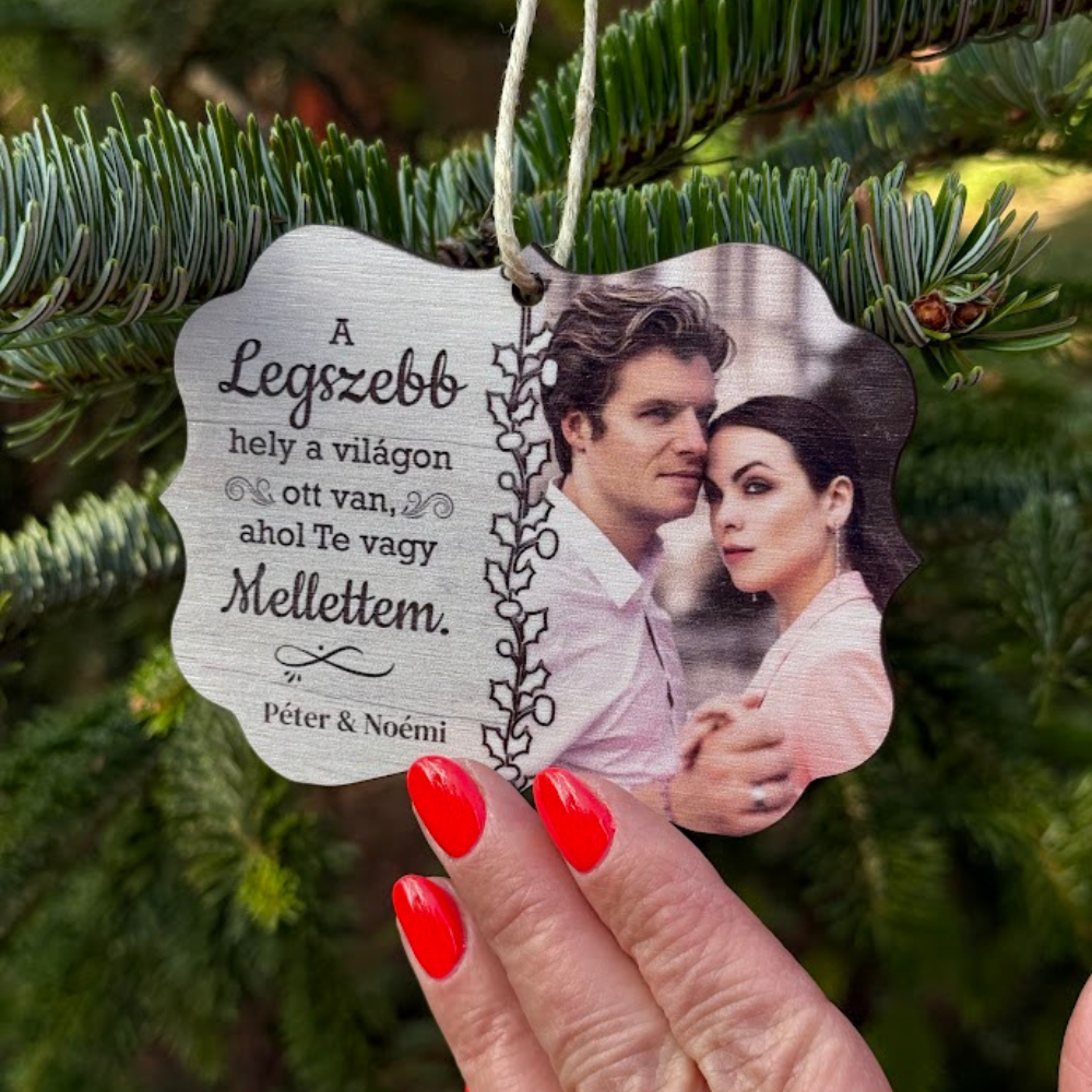 Ez a karácsonyfadísz több mint egy ajándék – a szeretet és az összetartozás szimbóluma. A rajta lévő fotó és üzenet minden évben emlékeztet arra, hogy az igazi érték nem a csillogásban, hanem az egymás iránti hűségben és melegségben rejlik. Egy személyes ajándék, ami újra és újra mosolyt csal az arcokra.